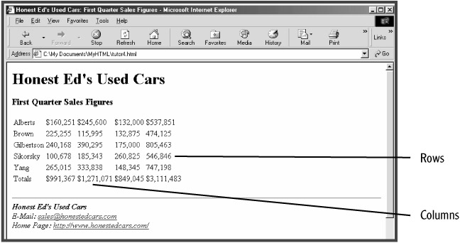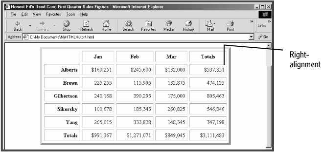 By default, the content of table cells is left-aligned. Use the ALIGN attribute to right-align the content of all cells within each table row (see Figure 5.11):