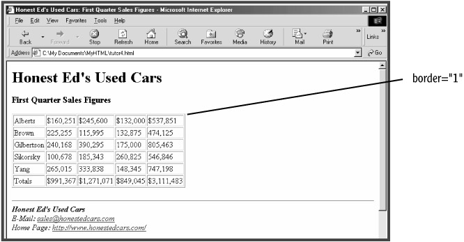 Adding a border to the table can help distinguish the data cells and make the table more readable. Use the BORDER attribute in the TABLE element to set a one-pixel border for the table (see Figure 5.4):