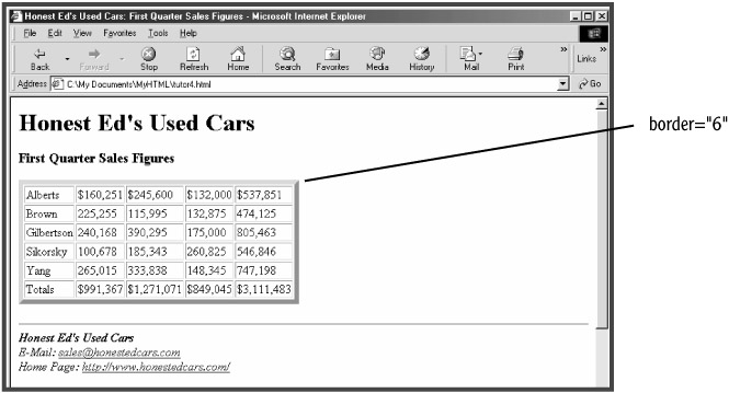 Increasing the value of the BORDER attribute increases the thickness of the outer border of the table, displaying it in 3D relief; however, it doesn't affect the appearance of the interior lines of the table. Increase the size of the border to 6 pixels (see Figure 5.5):