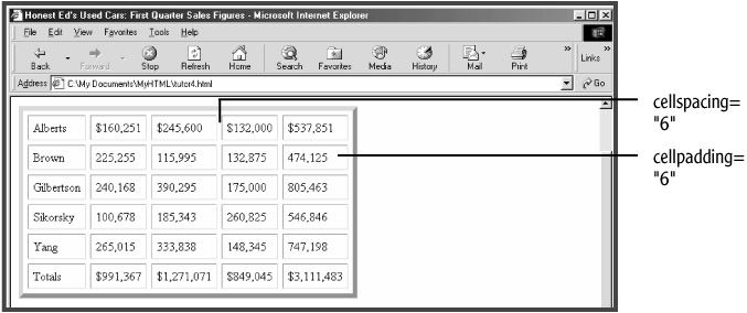The CELLSPACING attribute adds space between cells, whereas the CELLPADDING attribute adds space within each cell. Add six pixels of spacing and padding to the table (see Figure 5.6):