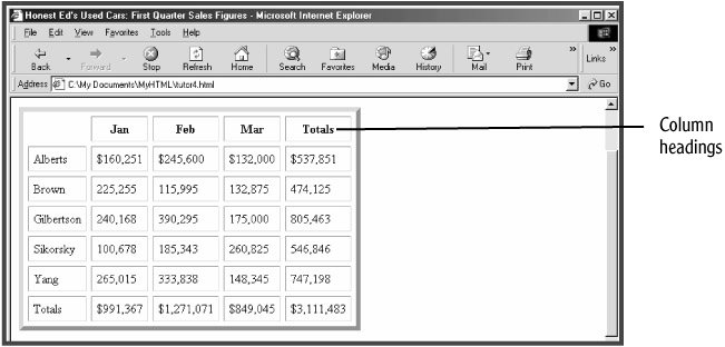The TH (Table Heading) element can be used to create column headings for a table. The TH element works the same as the TD element, except that nested text is bolded and centered. Add a row of column headings to the table (see Figure 5.7):