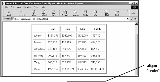 Use the ALIGN attribute to center the TABLE element (see Figure 5.8):