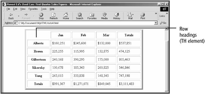 The TH element can also be used to add row headings to the table. To create row headings for the table, change the first TD element in each row into a TH cell (see Figure 5.10):