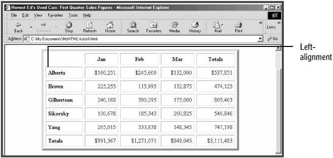 You can use the ALIGN attribute to horizontally align the content of individual TD or TH elements. Use the ALIGN attribute in the TH elements at the start of the rows to left-align the row headings (see Figure 5.12):