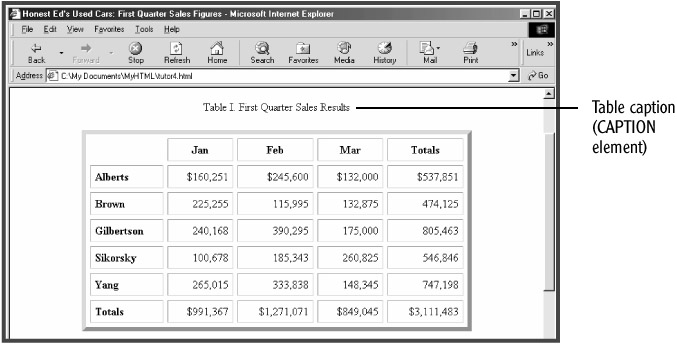 The CAPTION element lets you specify a table caption that can be displayed above or below the table. Use the CAPTION element to add a caption above the table (see Figure 5.13):