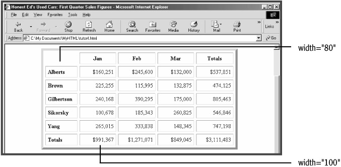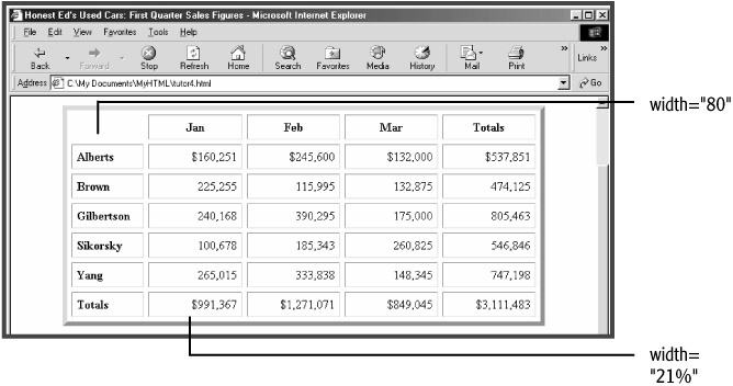 Setting column widths in pixels is relatively straightforward, although you should eliminate any width set for the table as a whole if you are setting widths for all of the columns. Eliminate the WIDTH attribute set in the TABLE element, and then set the first column of row headings to a width of 80 pixels and the other columns to widths of 100 pixels (see Figure 5.14):