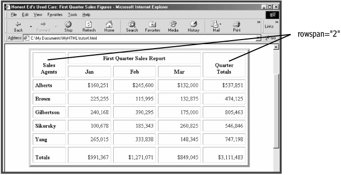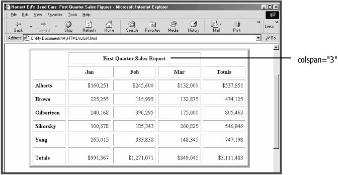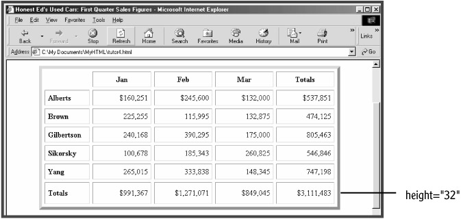 You can also use the HEIGHT attribute in any TH or TD element within a row to set a row height other than the default. Set a height of 32 pixels for the first cell in the "Totals" row (see Figure 5.16):