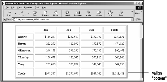 As the preceding example shows, the default vertical alignment for table cells is middle-alignment. The VALIGN attribute can be set in the TR, TH, or TD elements to change the default vertical alignment of table cells. The allowed values are middle, top, bottom, and baseline. Set the "Totals" row to be bottom-aligned (see Figure 5.17):