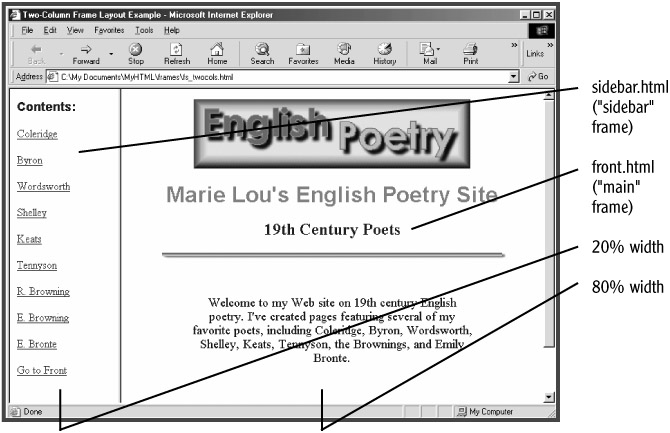 <frameset cols="20%,80%"> <frame src="sidebar.html" name="sidebar"> <frame src="front.html" name="main"> </frameset>
