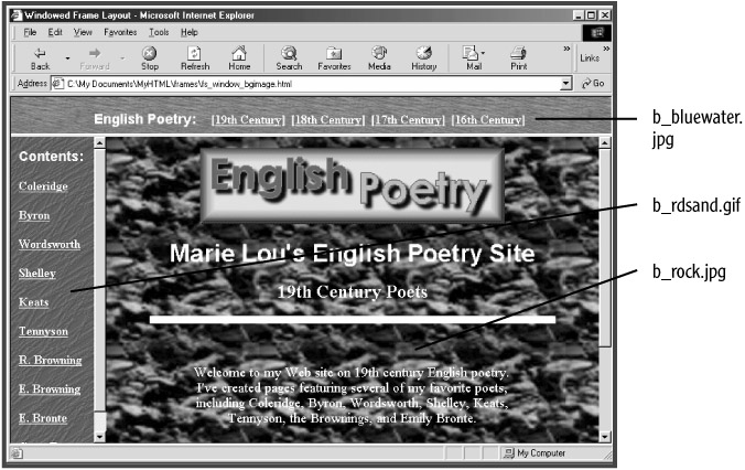 Using background images can be an effective way to dress up your frame pages. To do this, you need to specify background images for the framed pages and adjust any foreground colors to coordinate them with the background images. An example has already been created for you, which demonstrates how the appearance of a frame site can be dramatically transformed by the use of coordinated background images and foreground colors; just open fs_window_bgimage.html in your text editor or browser to check it out (see Figure 6.14):