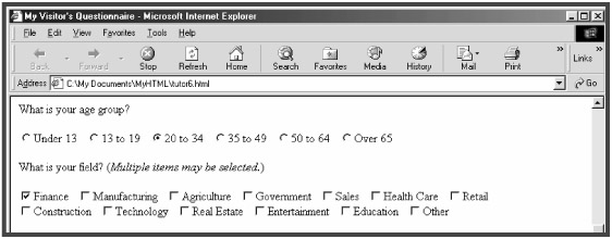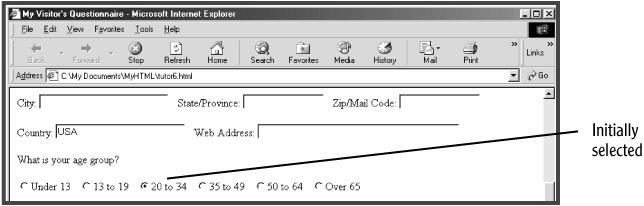 You can specify that a radio button should be selected initially by including a CHECKED attribute in the INPUT element. The CHECKED attribute is a standalone attribute that doesn't take a value. Specify that the "20 to 34" radio button should be initially selected (see Figure 7.5):