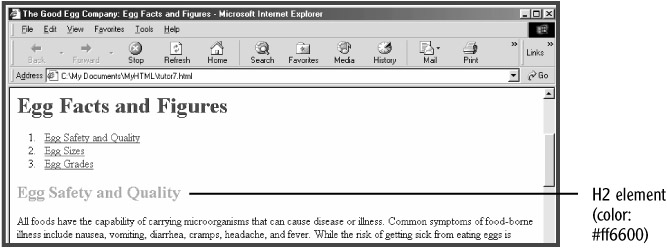 You've already added a style rule that uses one of the 16 standard color names (blue) to apply a color to the H1 element (see Figure 8.1). Since there isn't an orange color among the 16 standard color names, use an RGB hex code to specify that the H2 element should be displayed in an orange color (see Figure 8.2):