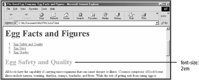 While pixel measurements are relative to the screen resolution, em measurements set font sizes relative to the parent element's font size. This allows you to set a font size that will scale up or down with the base font size, for instance. Set the H2 element to a size of two ems (see Figure 8.4):