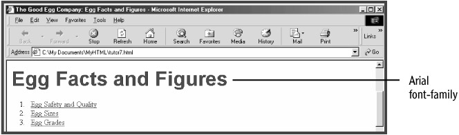 The FONT element's FACE attribute lets you specify a font face or list of font faces to be used when displaying an element. The font-family property lets you do the same thing using styles. Specify a list of fonts, starting with Arial, which can be applied to the H1 element (see Figure 8.5):