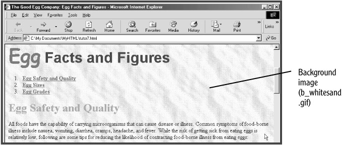 You can use styles to set a background image to be displayed behind the document body (or behind any other element). Set a background image to be displayed for the BODY element (see Figure 8.8):