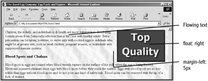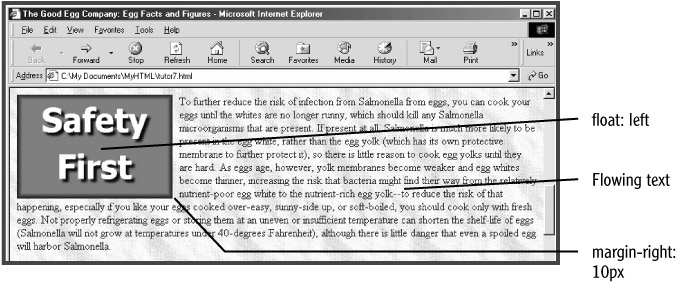 Unlike when using HTML's ALIGN attribute to float images, you can use the float property to also float other elements. For an element to be floated, however, its width needs to be set to less than 100 percent. Later in this session, in "Controlling Margins, Padding, and Borders," you will also learn how to create a drop-cap effect by setting a width for a SPAN element and then floating it.