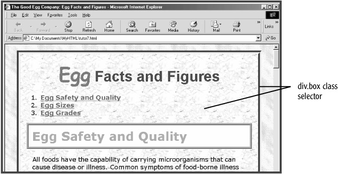 You can also use the DIV element to create a centered box. To try this out, first bracket the PRE element (in the "Egg Sizes" section) with a DIV element with a class="centerbox" attribute and delete the leading spaces inside the PRE element: