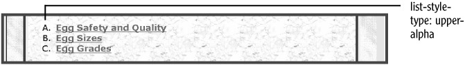 You can change the list type for both numbered and bulleted lists using the list-style-type property. To change an OL list's number type, you can set the following values: decimal (the default), lower-roman, upper-roman, lower-alpha, upper-alpha, lower-greek, hebrew, and none. To change a UL list's bullet type, you can set the following values: disc (the default), circle, square, and none. For example, use an inline style to change the number type of the document menu's OL element so the list will be displayed using uppercase alphabetic numbering (see Figure 8.17):