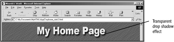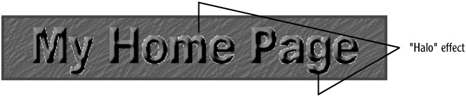 However, if you want to display a text banner saved as a transparent GIF, you need to be mindful that turning on anti-aliasing for the text in your image can cause problems when you display your image in a Web page with a dark background (or a background color or image that is significantly different in color from your image's background). That is because anti-aliasing blends the edges of letterforms with the image's background color; for instance, if your image's background color is white, but your Web page's background color or image is a dark color, you will see a very noticeable white "halo" effect displayed around the image's letterforms. An example file, myhome_halo.html, that demonstrates this in action is available with the other example files (see Figure C.5).