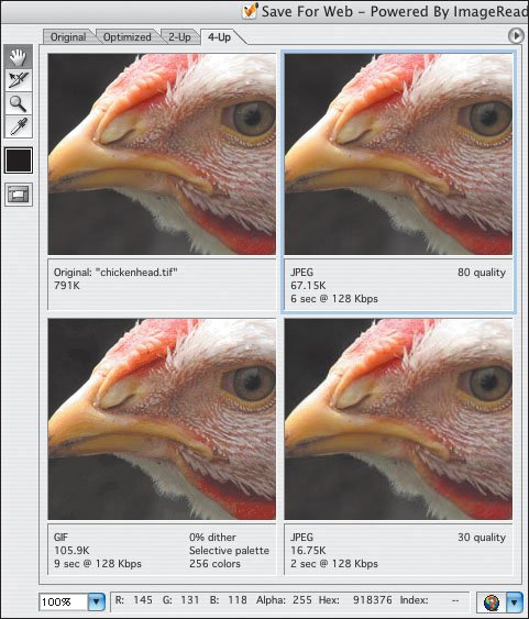 The Save for Web CommandBoth Adobe Photoshop and Adobe Photoshop Elements offer the awesome Save for Web command. It lets you visually compare the original image with up to three versions that you can optimize while keeping an eye on any resulting savings in file size and download time. To use Adobe's Save for Web command:
