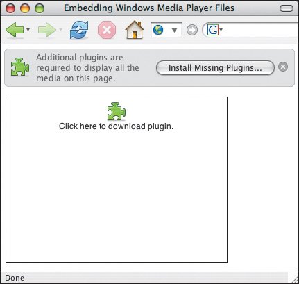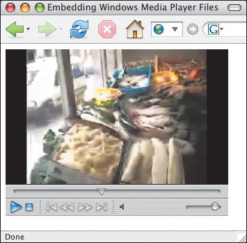 Embedding Windows Media, Part 1Microsoft's suggested way of embedding Windows format movies and sounds on your Web page still requires the use of the old nonstandard embed tagif you want it to work in anything besides Internet Explorer for Windows. I'll show you how to embed it in a standards-compliant way on page 304. To embed Windows Media Player files: