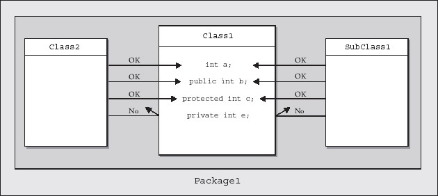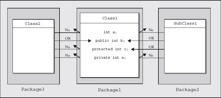 Here access is more restricted. The only members of Class1 that can be accessed from an ordinary class, Class2, in another package are those specified as public. Keep in mind that the class, Class1, must also have been defined with the attribute public. From a sub-class of Class1 that is in another package, the members of Class1, without an access attribute, cannot be reached, and neither can the private members – these can never be accessed externally under any circumstances.