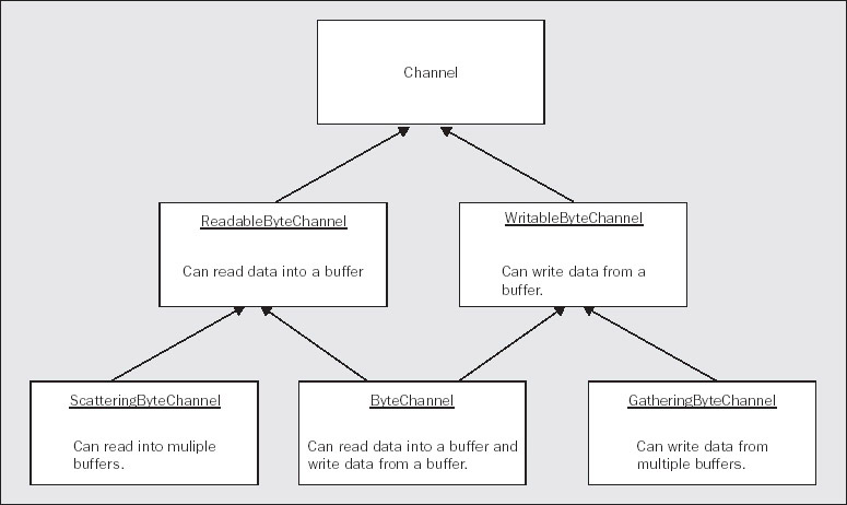 Each arrow points from a given interface to an interface that it implements. The ByteChannel interface simply combines the operations specified by the ReadableByteChannel and WritableByteChannel interface without declaring any additional methods. The ScatteringByteChannel interface extends the ReadableByteChannel interface by adding methods that allow data to be read and distributed amongst several separate buffers in a single operation. The GatheringByteChannel adds methods to those of the WritableByteChannel to permit writing from a number of separate buffers in a single operation.