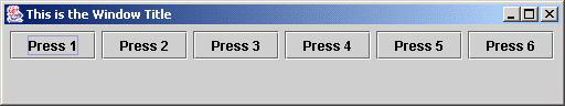 The Button objects are positioned by the layout manager flow. As you can see, they have been added to the first row in the window, and the row is centered. You can confirm that the row is centered and see how the layout manger automatically spills the components on to the next row once a row is full by reducing the size of the window.