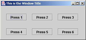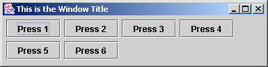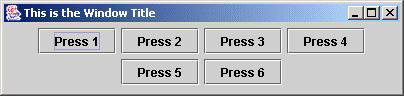 import javax.swing.JFrame; import javax.swing.JButton; import java.awt.Toolkit; import java.awt.Dimension; import java.awt.Container; import java.awt.FlowLayout; public class TryFlowLayout { // The window object static JFrame aWindow = new JFrame("This is a Flow Layout"); public static void main(String[] args) { Toolkit theKit = aWindow.getToolkit(); // Get the window toolkit Dimension wndSize = theKit.getScreenSize(); // Get screen size // Set the position to screen center & size to half screen size aWindow.setBounds(wndSize.width/4, wndSize.height/4, // Position wndSize.width/2, wndSize.height/2); // Size aWindow.setDefaultCloseOperation(JFrame.EXIT_ON_CLOSE); FlowLayout flow = new FlowLayout(); // Create a layout manager Container content = aWindow.getContentPane(); // Get the content pane content.setLayout(flow); // Set the container layout mgr // Now add six button components for(int i = 1; i <= 6; i++) content.add(new JButton("Press " + i)); // Add a Button to content pane aWindow.setVisible(true); // Display the window } }