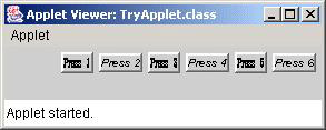 import javax.swing.JButton; import javax.swing.JApplet; import java.awt.Font; import java.awt.Container; import java.awt.FlowLayout; import javax.swing.border.BevelBorder; public class TryApplet extends JApplet { public void init() { Container content = getContentPane(); // Get content pane content.setLayout(new FlowLayout(FlowLayout.RIGHT)); // Set layout JButton button; // Stores a button Font[] fonts = { new Font("Arial", Font.ITALIC, 10), // Two fonts new Font("Playbill", Font.PLAIN, 14) }; BevelBorder edge = new BevelBorder(BevelBorder.RAISED); // Bevelled border // Add the buttons using alternate fonts for(int i = 1; i <= 6; i++) { content.add(button = new JButton("Press " + i)); // Add the button button.setFont(fonts[i%2]); // One of our own fonts button.setBorder(edge); // Set the button border } } }