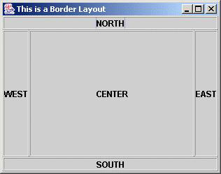 import javax.swing.JFrame; import javax.swing.JButton; import java.awt.Toolkit; import java.awt.Dimension; import java.awt.Container; import java.awt.BorderLayout; import javax.swing.border.EtchedBorder; public class TryBorderLayout { // The window object static JFrame aWindow = new JFrame("This is a Border Layout"); public static void main(String[] args) { Toolkit theKit = aWindow.getToolkit(); // Get the window toolkit Dimension wndSize = theKit.getScreenSize(); // Get screen size // Set the position to screen center & size to half screen size aWindow.setBounds(wndSize.width/4, wndSize.height/4, // Position wndSize.width/2, wndSize.height/2); // Size aWindow.setDefaultCloseOperation(JFrame.EXIT_ON_CLOSE); BorderLayout border = new BorderLayout(); // Create a layout manager Container content = aWindow.getContentPane(); // Get the content pane content.setLayout(border); // Set the container layout mgr EtchedBorder edge = new EtchedBorder(EtchedBorder.RAISED); // Button border // Now add five JButton components and set their borders JButton button; content.add(button = new JButton("EAST"), BorderLayout.EAST); button.setBorder(edge); content.add(button = new JButton("WEST"), BorderLayout.WEST); button.setBorder(edge); content.add(button = new JButton("NORTH"), BorderLayout.NORTH); button.setBorder(edge); content.add(button = new JButton("SOUTH"), BorderLayout.SOUTH); button.setBorder(edge); content.add(button = new JButton("CENTER"), BorderLayout.CENTER); button.setBorder(edge); aWindow.setVisible(true); // Display the window } }