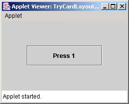 import javax.swing.JApplet; import javax.swing.JButton; import java.awt.Container; import java.awt.CardLayout; import java.awt.event.ActionEvent; // Classes to handle events import java.awt.event.ActionListener; public class TryCardLayout extends JApplet implements ActionListener { CardLayout card = new CardLayout(50,50); // Create layout public void init() { Container content = getContentPane(); content.setLayout(card); // Set card as the layout mgr JButton button; // Stores a button for(int i = 1; i <= 6; i++) { content.add(button = new JButton("Press " + i), "Card" + i); // Add a button button.addActionListener(this); // Add listener for button } } // Handle button events public void actionPerformed(ActionEvent e) { card.next(getContentPane()); // Switch to the next card } }