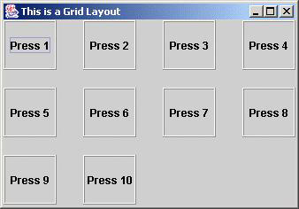 import javax.swing.JFrame; import java.awt.*; import javax.swing.border.EtchedBorder; public class TryGridLayout { // The window object static JFrame aWindow = new JFrame("This is a Grid Layout"); public static void main(String[] args) { Toolkit theKit = aWindow.getToolkit(); // Get the window toolkit Dimension wndSize = theKit.getScreenSize(); // Get screen size // Set the position to screen center & size to half screen size aWindow.setBounds(wndSize.width/4, wndSize.height/4, // Position wndSize.width/2, wndSize.height/2); // Size aWindow.setDefaultCloseOperation(JFrame.EXIT_ON_CLOSE); GridLayout grid = new GridLayout(3,4,30,20); // Create a layout manager Container content = aWindow.getContentPane(); // Get the content pane content. setLayout(grid); // Set the container layout mgr EtchedBorder edge = new EtchedBorder(EtchedBorder.RAISED); // Button border // Now add ten Button components JButton button; // Stores a button for(int i = 1; i <= 10; i++) { content.add(button = new JButton("Press " + i)); // Add a Button button.setBorder(edge); // Set the border } aWindow.setVisible(true); // Display the window } }