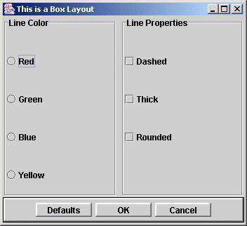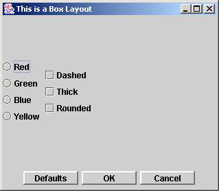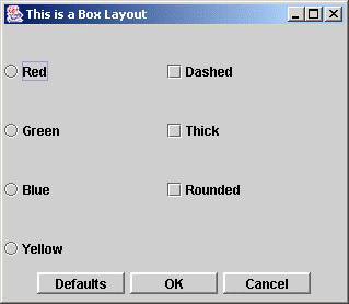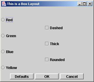 import javax.swing.*; import java.awt.Toolkit; import java.awt.Dimension; import java.awt.Container; import java.awt.BorderLayout; import javax.swing.border.Border; public class TryBoxLayout { // The window object static JFrame aWindow = new JFrame("This is a Box Layout"); public static void main(String[] args) { Toolkit theKit = aWindow.getToolkit(); // Get the window toolkit Dimension wndSize = theKit.getScreenSize(); // Get screen size // Set the position to screen center & size to half screen size aWindow.setBounds(wndSize.width/4, wndSize.height/4, // Position wndSize.width/2, wndSize.height/2); // Size aWindow.setDefaultCloseOperation(JFrame.EXIT_ON_CLOSE); // Create left column of radio buttons Box left = Box.createVerticalBox(); ButtonGroup radioGroup = new ButtonGroup(); // Create button group JRadioButton rbutton; // Stores a button radioGroup.add(rbutton = new JRadioButton("Red")); // Add to group left.add(rbutton); // Add to Box radioGroup.add(rbutton = new JRadioButton("Green")); left.add(rbutton); radioGroup.add(rbutton = new JRadioButton("Blue")); left.add(rbutton); radioGroup.add(rbutton = new JRadioButton("Yellow")); left.add(rbutton); // Create right columns of checkboxes Box right = Box.createVerticalBox(); right.add(new JCheckBox("Dashed")); right.add(new JCheckBox("Thick")); right.add(new JCheckBox("Rounded")); // Create top row to hold left and right Box top = Box.createHorizontalBox(); top.add(left); top.add(right); // Create bottom row of buttons JPanel bottomPanel = new JPanel(); Border edge = BorderFactory.createRaisedBevelBorder(); // Button border JButton button; Dimension size = new Dimension(80,20); bottomPanel.add(button = new JButton("Defaults")); button.setBorder(edge); button.setPreferredSize(size); bottomPanel.add(button = new JButton("OK")); button.setBorder(edge); button.setPreferredSize(size); bottomPanel.add(button = new JButton("Cancel")); button.setBorder(edge); button.setPreferredSize(size); // Add top and bottom panel to content pane Container content = aWindow.getContentPane(); // Get content pane content.setLayout(new BorderLayout()); // Set border layout manager content.add(top, BorderLayout.CENTER); content.add(bottomPanel, BorderLayout.SOUTH); aWindow.setVisible(true); // Display the window } }