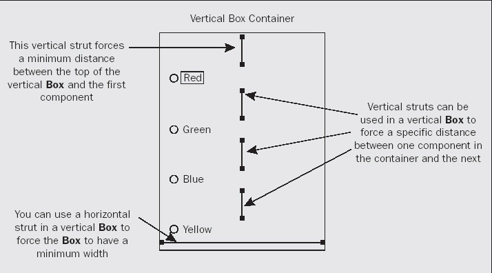 The Box class contains static methods to create an invisible component called a strut. A vertical strut has a given height in pixels and zero width. A horizontal strut has a given width in pixels and zero height. The purpose of these struts is to enable you to insert space between your components, either vertically or horizontally. By placing a horizontal strut between two components in a horizontally arranged Box container, you fix the distance between the components. By adding a horizontal strut to a vertically arranged Box container, you can force a minimum width on the container. You can use a vertical strut in a horizontal box to force a minimum height.