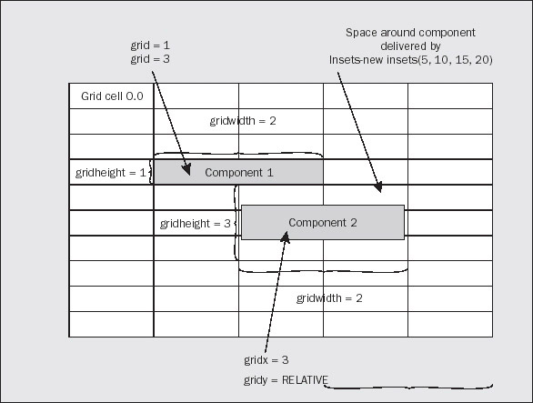 The top-left cell in a layout is at position (0, 0). You specify the position of a component by defining where the top-left cell that it occupies is, relative to either the grid origin, or relative to the last component that was added to the container. You specify the position of the top-left cell that a component occupies in the grid by setting values of type int for the gridx and gridy members of the GridBagConstraints object. The default value for gridx is GridBagConstraints.RELATIVE – a constant that places the top-left grid position for the component in the column immediately to the right of the previous component. The same value is the default for gridy, which places the next component immediately below the previous one.