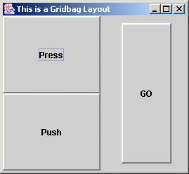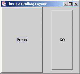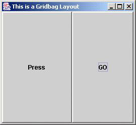 import javax.swing.*; import java.awt.*; import javax.swing.border.Border; public class TryGridBagLayout { // The window object static JFrame aWindow = new JFrame("This is a Gridbag Layout"); public static void main(String[] args) { Toolkit theKit = aWindow.getToolkit(); // Get the window toolkit Dimension wndSize = theKit.getScreenSize(); // Get screen size // Set the position to screen center & size to half screen size aWindow.setBounds(wndSize.width/4, wndSize.height/4, // Position wndSize.width/2, wndSize.height/2); // Size aWindow.setDefaultCloseOperation(JFrame.EXIT_ON_CLOSE); GridBagLayout gridbag = new GridBagLayout(); // Create a layout manager GridBagConstraints constraints = new GridBagConstraints(); aWindow.getContentPane().setLayout(gridbag); // Set the container layout mgr // Set constraints and add first button constraints.weightx = constraints.weighty = 10.0; constraints.fill = constraints.BOTH; // Fill the space addButton("Press", constraints, gridbag); // Add the button // Set constraints and add second button constraints.gridwidth = constraints.REMAINDER; // Rest of the row addButton("GO", constraints, gridbag); // Create and add button aWindow.setVisible(true); // Display the window } static void addButton(String label, GridBagConstraints constraints, GridBagLayout layout) { // Create a Border object using a BorderFactory method Border edge = BorderFactory.createRaisedBevelBorder(); JButton button = new JButton(label); // Create a button button.setBorder(edge); // Add its border layout.setConstraints(button, constraints); // Set the constraints aWindow.getContentPane().add(button); // Add button to content pane } }