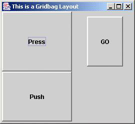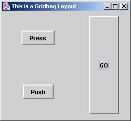 // Create constraints and add first button constraints.weightx = constraints.weighty = 10.0; constraints.fill = constraints.NONE; constraints.ipadx = 30; // Pad 30 in x constraints.ipady = 10; // Pad 10 in y addButton("Press", constraints, gridbag); // Add button to content pane // Set constraints and add second button constraints.weightx = 5.0; // Weight half of first constraints.fill = constraints.BOTH; // Expand to fill space constraints.ipadx = constraints.ipady = 0; // No padding constraints.gridwidth = constraints.REMAINDER; // Rest of the row constraints.gridheight = 2; // Height 2x "Press" constraints.insets = new Insets(10, 30, 10, 20); // Left 30 & right 20 addButton("GO", constraints, gridbag); // Add button to content pane // Set constraints and add third button constraints.gridx = 0; // Begin new row constraints.fill = constraints.NONE; constraints.ipadx = 30; // Pad component in x constraints.ipady = 10; // Pad component in y constraints.gridwidth = 1; // Width as "Press" constraints.gridheight = 1; // Height as "Press" constraints.insets = new Insets(0, 0, 0, 0); // No insets addButton("Push", constraints, gridbag); // Add button to content pane