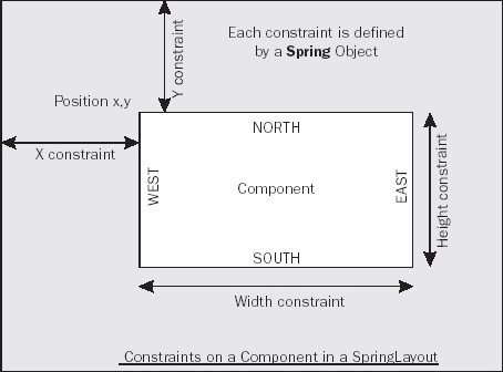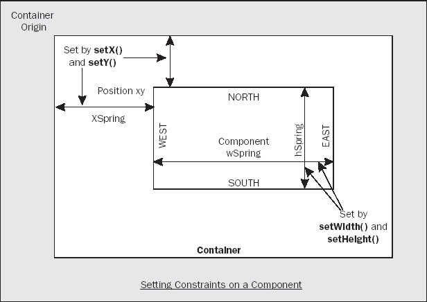 You can set the X, Y, width, and height constraints independently as we shall see in a moment, and you can also set a constraint explicitly for any edge. If you set a constraint on the SOUTH or EAST edges of a component, the Y or X constraint will be adjusted if necessary to ensure the relationships above still hold.
