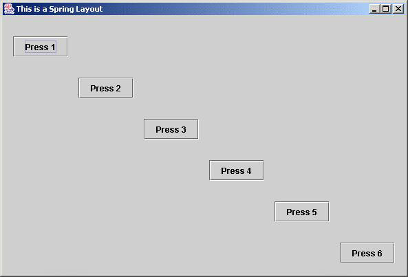 import javax.swing.JButton; import javax.swing.JFrame; import javax.swing.SpringLayout; import javax.swing.Spring; import java.awt.Container; import java.awt.Dimension; import java.awt.Toolkit; public class TrySpringLayout { // The window object static JFrame aWindow = new JFrame("This is a Spring Layout"); public static void main(String[] args) { Toolkit theKit = aWindow.getToolkit(); // Get the window toolkit Dimension wndSize = theKit.getScreenSize(); // Get screen size // Set the position to screen center & size to half screen size aWindow.setBounds(wndSize.width/4, wndSize.height/4, // Position wndSize.width/2, wndSize.height/2); // Size aWindow.setDefaultCloseOperation(JFrame.EXIT_ON_CLOSE); SpringLayout layout = new SpringLayout(); // Create a layout manager Container content = aWindow.getContentPane(); // Get the content pane content.setLayout(layout); // Set the container layout mgr JButton[] buttons = new JButton[6]; // Array to store buttons for(int i = 0; i < buttons.length; i++) { buttons[i] = new JButton("Press " + (i+1)); content.add(buttons[i]); // Add a Button to content pane } Spring xSpring = Spring.constant(5,15,25); // x constraint for 1st button Spring ySpring = Spring.constant(10,30, 50); // y constraint for first button Spring wSpring = Spring.constant(30,80,130); // Width constraint for buttons // Connect x,y for first button to left and top of container by springs SpringLayout.Constraints buttonConstr = layout.getConstraints(buttons[0]); buttonConstr.setX(xSpring); buttonConstr.setY(ySpring); // Set width and height of buttons and hook buttons together for(int i = 0 ; i< buttons.length ; i++) { buttonConstr = layout.getConstraints(buttons[i]); buttonConstr.setHeight(ySpring); // Set the button height constraint buttonConstr.setWidth(wSpring); // and its width constraint // For buttons after the first tie W and N edges to E and N of predecessor if(i>0) { layout.putConstraint(SpringLayout.WEST, buttons[i], xSpring,SpringLayout.EAST, buttons[i-1]); layout.putConstraint(SpringLayout.NORTH, buttons[i], ySpring,SpringLayout.SOUTH, buttons[i-1]); } } aWindow.setVisible(true); // Display the window } }