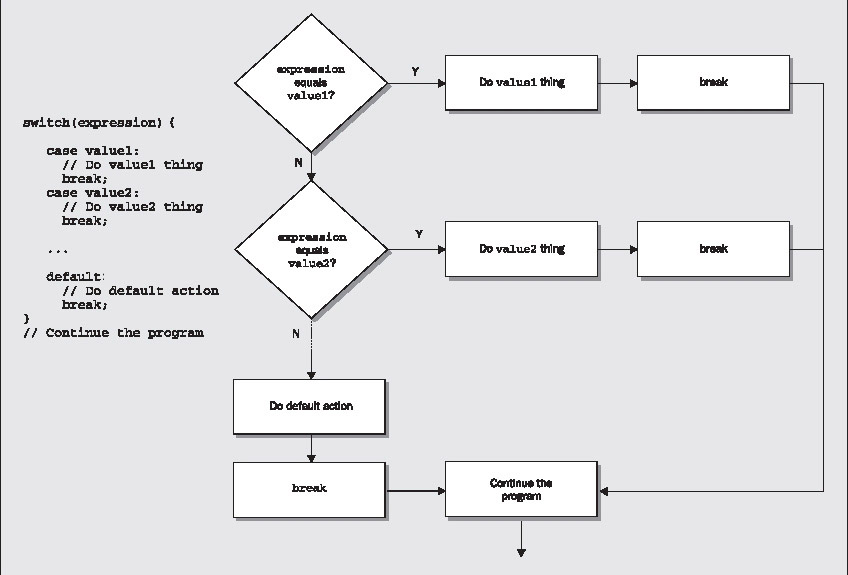 Now when a case label value is equal to the switch expression, the code for that case is executed, and we fall through to execute all the other cases that follow, including that for the default case if that follows. This is not usually what you want, so make sure you don't forget the break statements.