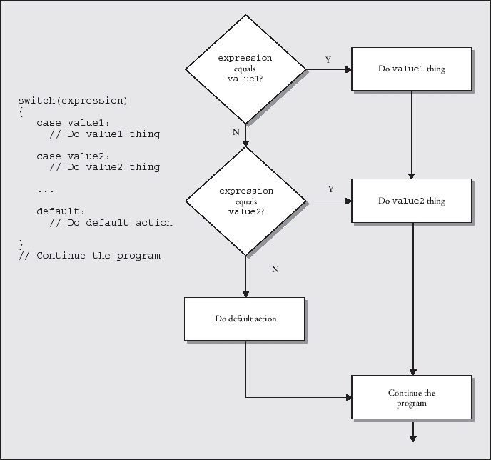 There is a case label for each handled choice in the switch, and they must all be unique. The default case we have in the example above is, in general, optional. It is selected when the value of the expression for the switch does not correspond with any of the case values that have been defined. If you don't specify a default case and the value of the switch expression does not match any of the case labels, execution continues at the statement following the closing brace of the switch statement.