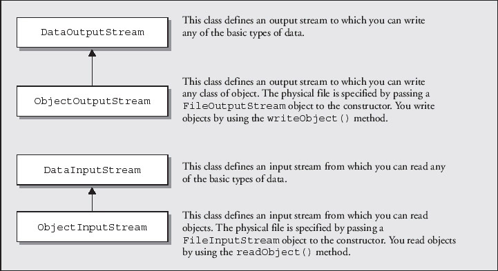 Two classes from the java.io package are used for serialization. An ObjectOutputStream object manages the writing of objects to a file, and reading the objects back is handled by an object of the class ObjectInputStream. As we saw in Chapter 8, these are derived from OutputStream and InputStream, respectively.