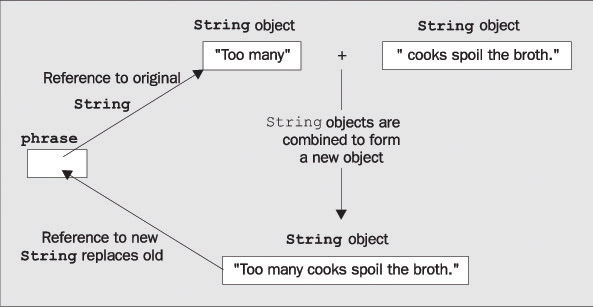 After executing these statements the variable phrase will refer to the string "Too many cooks spoil the broth". Note that this does not modify the string "Too many". The string that is referenced by phrase after this statement has been executed is a completely new String object. This is illustrated on the following page.