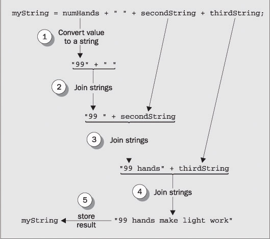 Behind the scenes, the value of the variable numHands is being converted to a string that represents this value as a decimal number. This is prompted by the fact that it is combined with the string literal, " ". Dissimilar types in a binary operation cannot be operated on, so one operand must be converted to the type of the other if the operation is to be possible. Here the compiler arranges that the numerical value stored in numHands is converted to type String to match the type of the right operand of the + operator. If you look back at the table of operator precedences, you will see that the associativity of the operator + is from left to right, so the strings are combined in pairs starting from the left, as shown in the diagram.