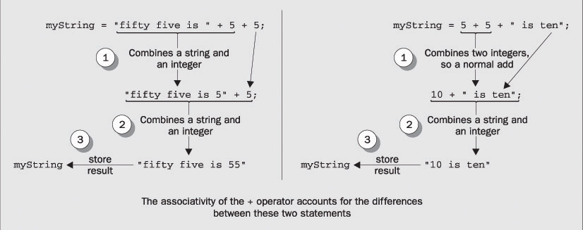 The left-to-right associativity of the + operator is important in understanding the next two lines of output. The two statements involved in creating these strings look very similar. Why does "5 + 5" result in 55 in one statement, and 10 in the other? The reason is illustrated below.