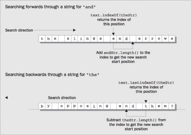 To count the occurrences of the substring "the" the program searches the string text backwards, by using the method lastIndexOf() instead of indexOf(). This works in much the same way, the only significant difference being that we decrement the value of index, instead of incrementing it. This is because the next occurrence of the substring has to be at least that many characters back from the first character of the substring we have just found. If the string "the" happened to occur at the beginning of the string we are searching, the lastIndexOf() method would be called with a negative value for index. This would not cause any problem - it would just result in -1 being returned in any event.
