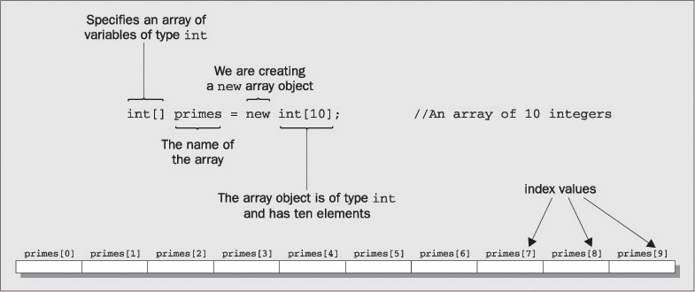 This statement creates an array that will store 10 values of type int, and records a reference to the array in the variable primes. The reference is simply where the array is in memory. You could also declare the array variable and define the array of type int to hold 10 prime numbers with a single statement, as shown in the following illustration: