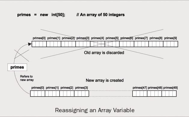 The array variable is separate from the array itself. Rather like the way an ordinary variable can refer to different values at different times, you can use an array variable to reference different arrays at different points in your program. Suppose you have declared and defined the variable primes as before:
