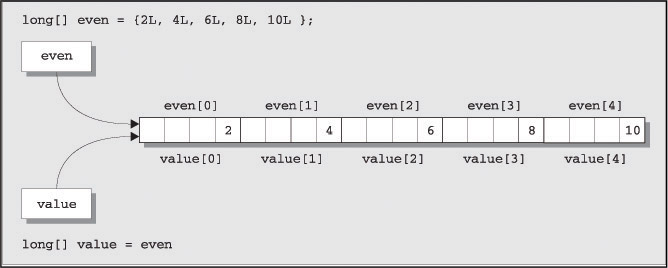 You have created two array variables, but you only have one array. Both arrays refer to the same set of elements and you can access the elements of the array through either variable name – for example, even[2] refers to the same variable as value[2]. One use for this is when you want to switch the arrays referenced by two variables. If you were sorting an array by repeatedly transferring elements from one array to another, by flipping the array you were copying from with the array you were copying to, you could use the same code. For example, if we declared array variables as: